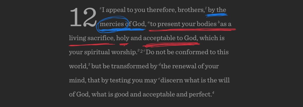 In his urging, is “by the mercies of God.” If you took the time to read through Romans 1-11, it richly expounds on the great mercy of God toward sinful humanity. It was a mercy that took Jesus to the cross.