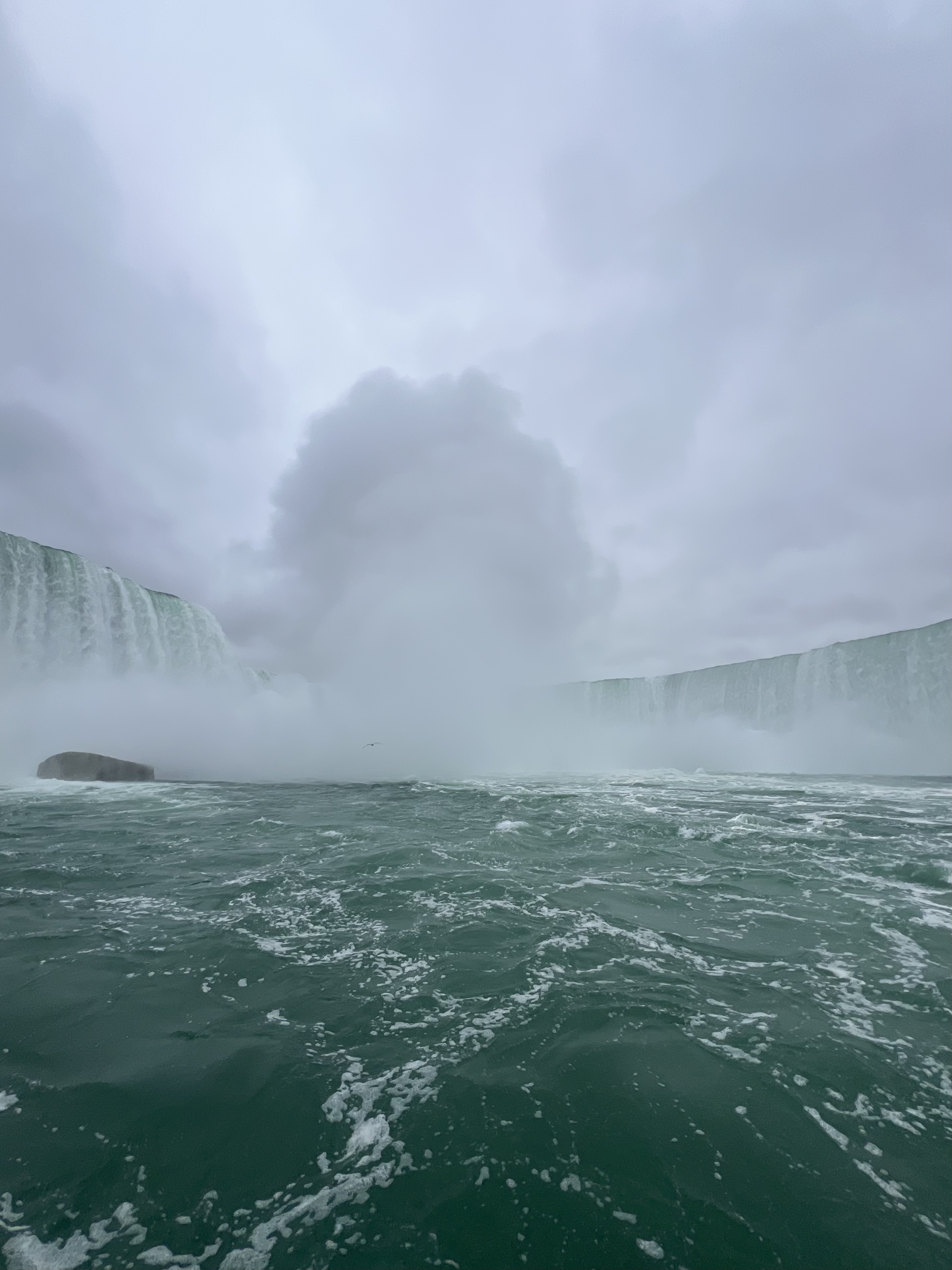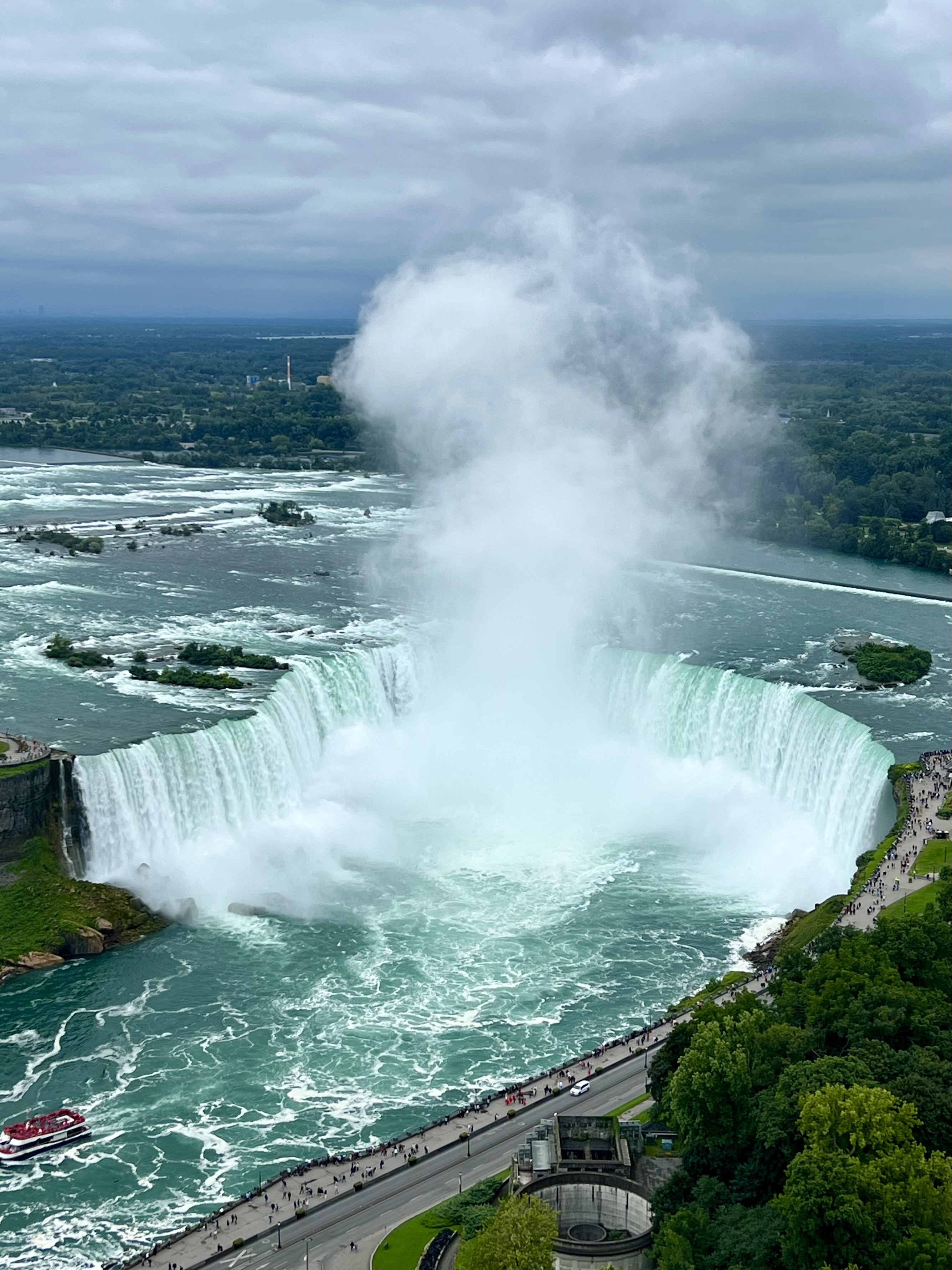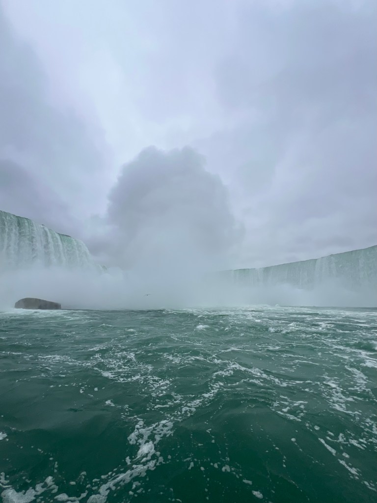 We also took the a cruise out to the middle of Horseshoe Falls (the largest part of the falls and that shown most in photos). They provide a rain poncho for everyone who goes, and it is needed. The closer you come to the falling water, the wetter you get! The force of the tons of water crashing into the river below creates clouds of mist and moves a lot of air. It felt like a very windy day.