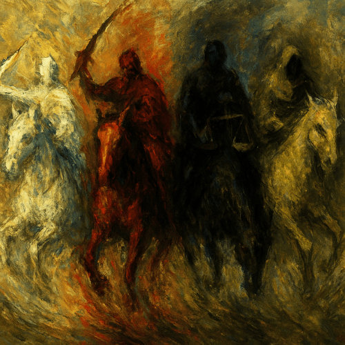 These seals reveal the Four Horsemen of the Apocalypse—symbolizing global events that bring chaos, fear, and devastation.