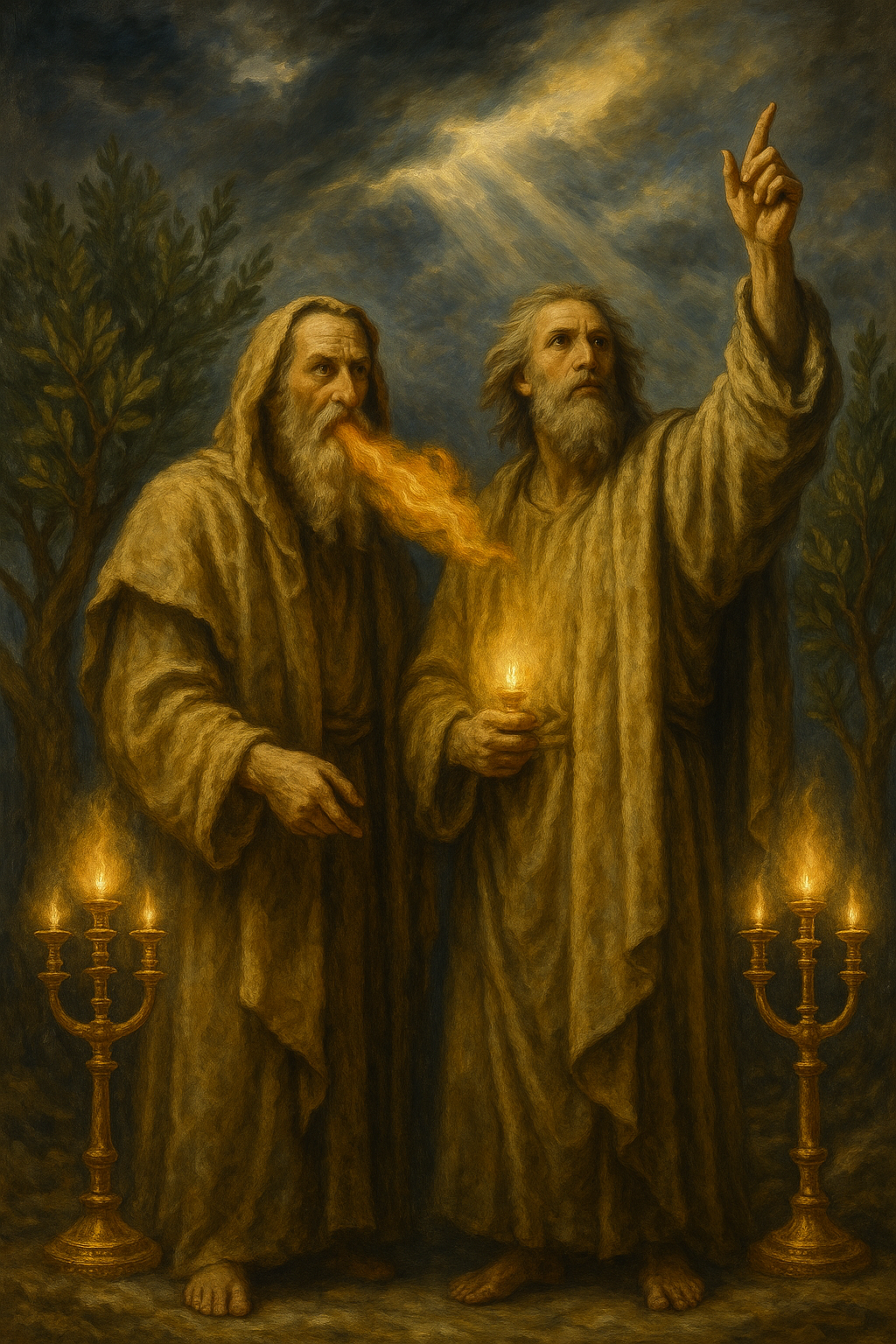 - Two olive trees and two lampstands (Zechariah imagery—God-empowered witnesses bringing light)