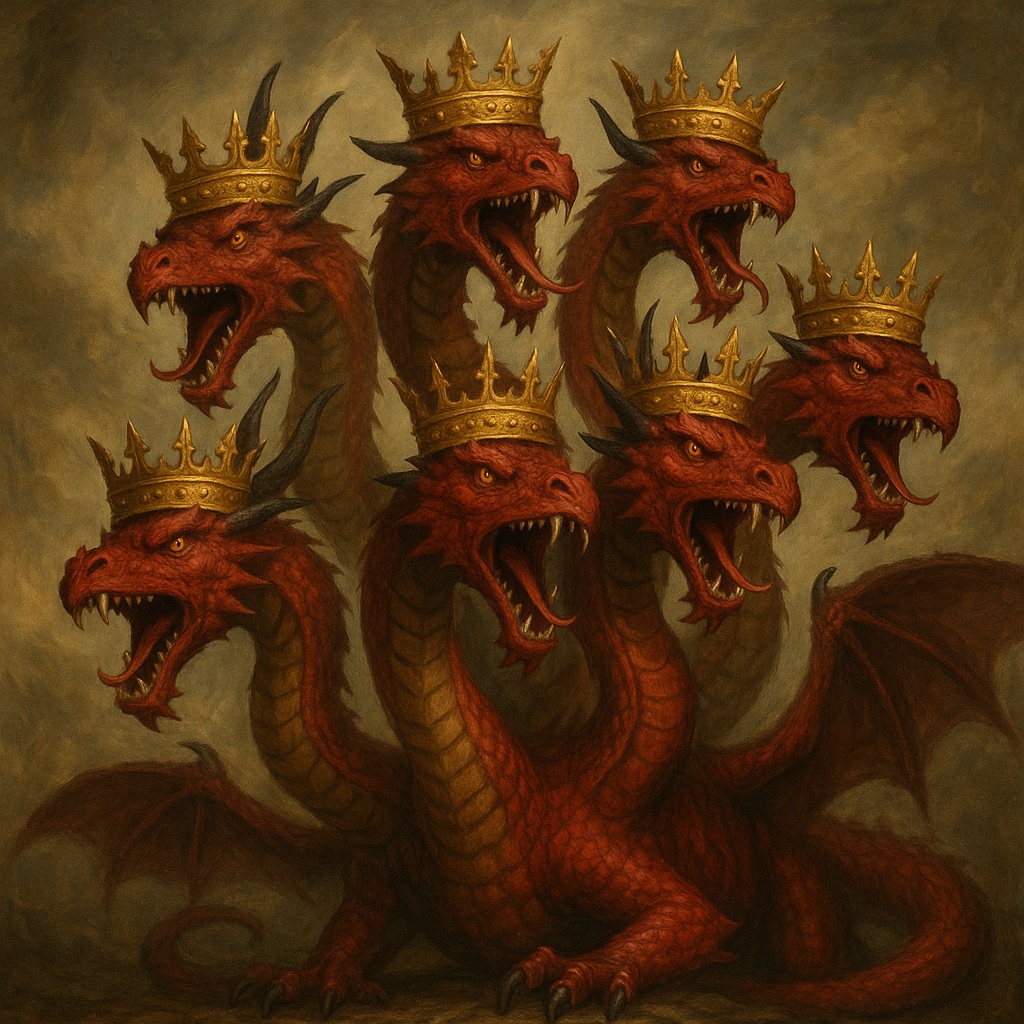- A great red dragon, identified in v. 9 as Satan, has seven heads, ten horns, and seven crowns.