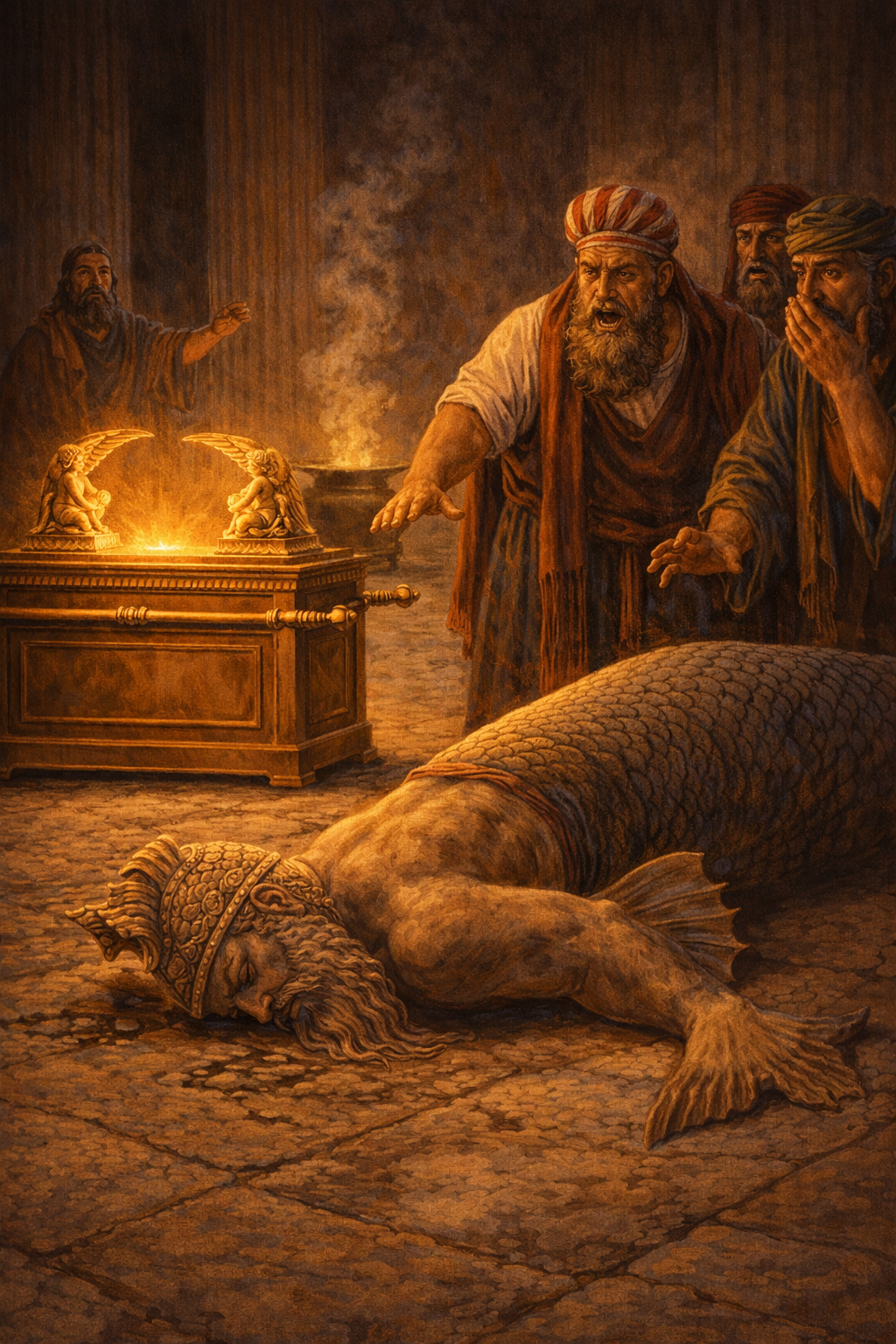 Twice, Dagon falls before the Ark—first bowed, then broken.